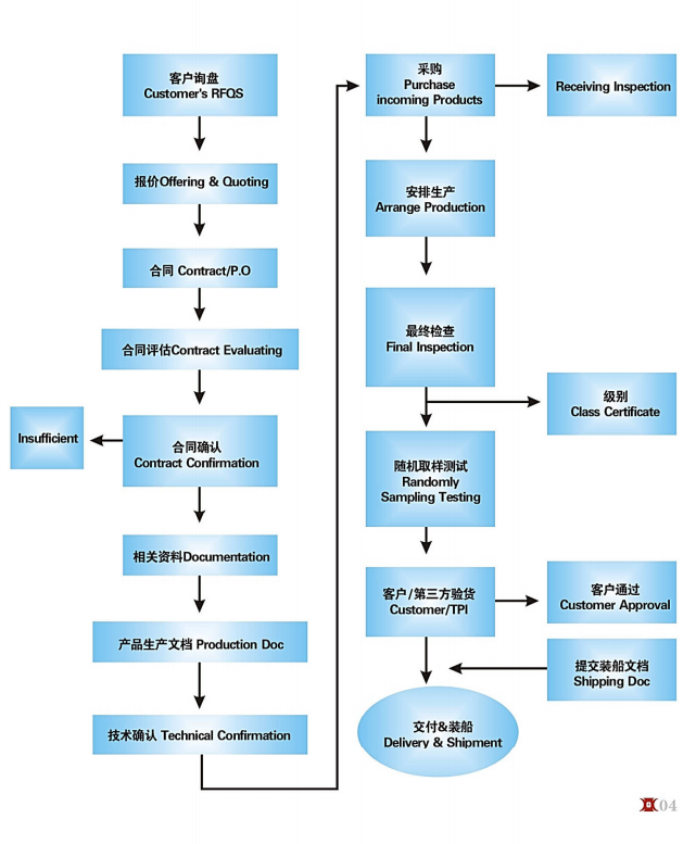 All orders received from our customer shall be processed in accordance with our company quality control policy, also manufacturing and inspection plan shall be prepared and on request submitted to client for review,approved Inspection&test plan shall be used to monitor quality control and acceptance tests during all activities